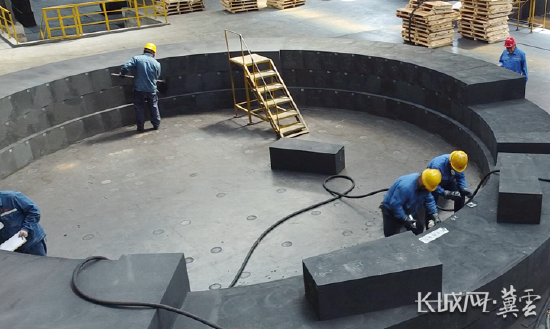 这些块重千斤的“大家伙”拼接后缝隙可控制在0.5毫米之内——武彭炉衬总经理助理李孜向记者介绍这些正在预砌的炭砖:“可别小看这些炭砖,这是咱们国际首创采用树脂结合剂生产的,具有自主知识产权,性能达到国际一流水平。”